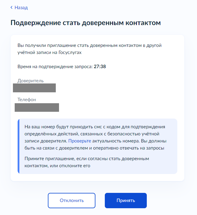 7. Проверьте данные доверителя и при согласии стать доверенным контактом нажмите клавишу «Принять».
