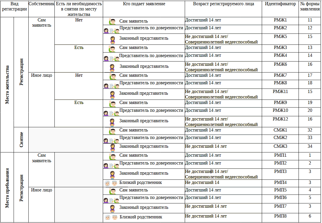 1 | РМП1/РМЖ1 | - Физическое лицо, являющееся гражданином РФ, за регистрацией по месту пребывания в жилом помещении, принадлежащему ему на праве собственности, обращается лично (при достижении 14-летнего возраста); - Физическое лицо, являющееся гражданином РФ, за регистрацией по месту жительства в жилом помещении, принадлежащем ему на праве собственности, не имеющее регистрации по месту жительства, обращается лично (при достижении 14-летнего возраста). |